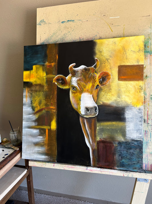 “Plenty” - “I bought this large painting of a cow looking out of its stall. The eyes are wonderful and follow me as I walk past it. What a treat it has been to have this painting in my home!”