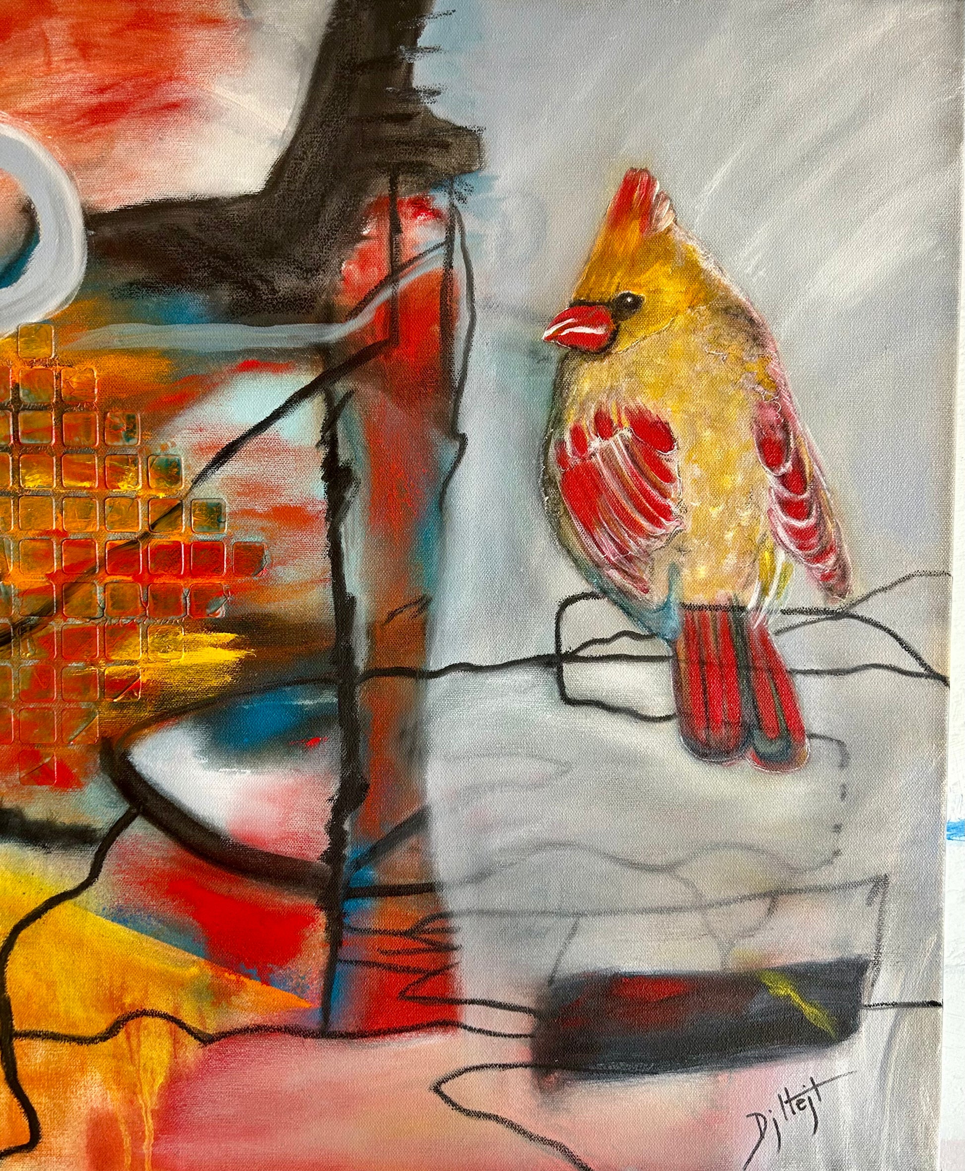 “Mama Joy” by DJ Hejtmanek is a mixed media abstract finished with oils of a female cardinal on 20x24” gallery-wrapped canvas. Hanging wire is installed; no need to frame unless desired. Heart Note is sent with painting. Free shipping in US.